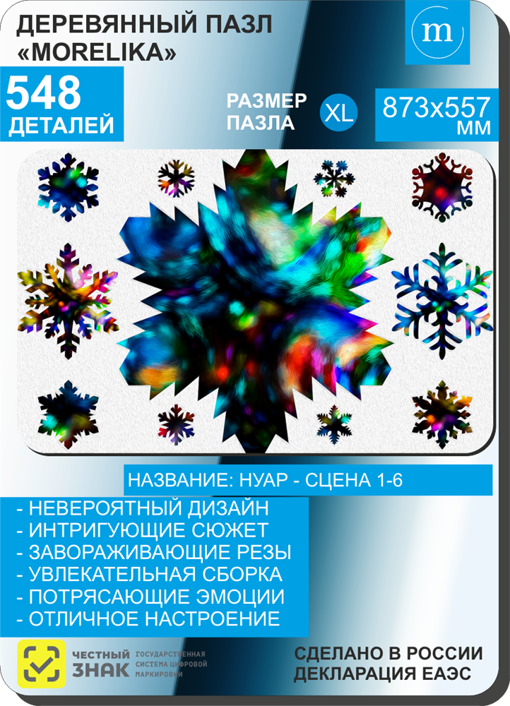 Размер (XL): 873х557мм (пазл состоит из 11 снежинок разной величины, а у особо внимательных их получиться 17)